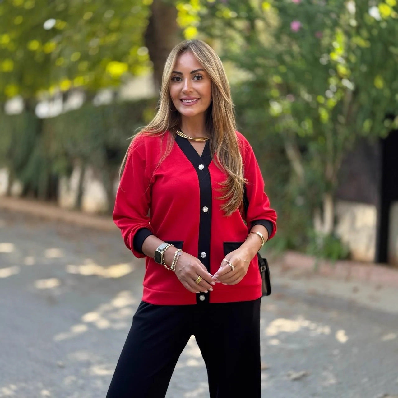 Cárdigan Tejido de Mujer con Contraste de Color y Cuello en V